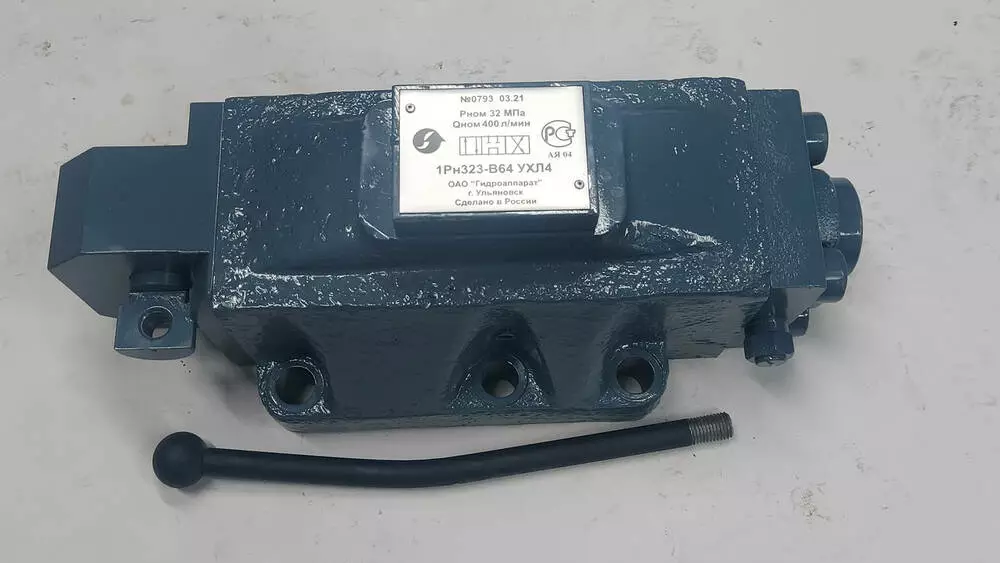 Гідророзподільник 1Рн323В574 з умовним проходом 32 мм, золотисті, чотирилінійні, з безпосереднім (ручним) керуванням із фіксацією призначені для зміни напрямку або пуску та зупинки потоку робочої рідини в гідравлічних системах промислового обладнання.