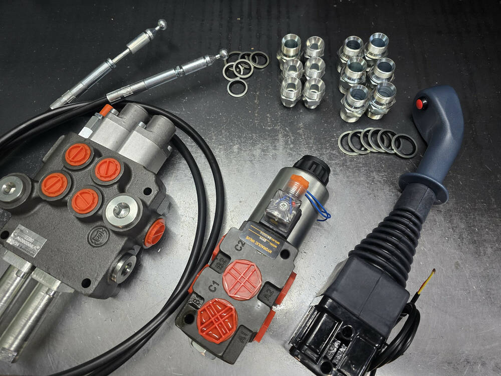 Принцип роботи цього комплекту зображений схематично на малюнку. На щелепні навантажувачі додатково ставиться електричний дивертер потоку 12 В або 24 В на одну зі секцій гідророзподільника, а також джойстик із кнопкою, за допомогою якої перемикається цей електричний дивертер і перенаправляє потім з одного на інший гідроциліндр. Отже, ви керуєте трьома секціями за допомогою одного джойстика з кнопкою, встановленої в кабіні трактора.
