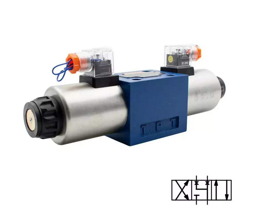Гідравлічні розподілники 4WE10W-3XCG24N9Z5L (ДУ10, схема W, 84 схема) призначені для керування й зміни напрямку або пуску та зупинки потоками робочих рідин у гідравлічних системах. Перемикання положення золотника відбувається за допомогою керівного елемента — електромагнітного (привода електромагнітного).