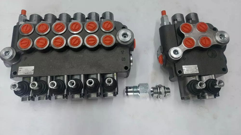 Гідророзподільник моноблоковий комплект 6 секцій +1 секція імпортний на 80 л/хв, виробництва провідних заводів гідравліки Hidros, GMS Hydraulics з ручним керуванням на 3 положення та пружинним поверненням ручки в нейтральне положення. Під'єднання другого гідророзподільника відбувається за допомогою спеціального штуцера — подовжувача тиску. Ціна вказана за комплект на важелях (без урахування джойстиків)