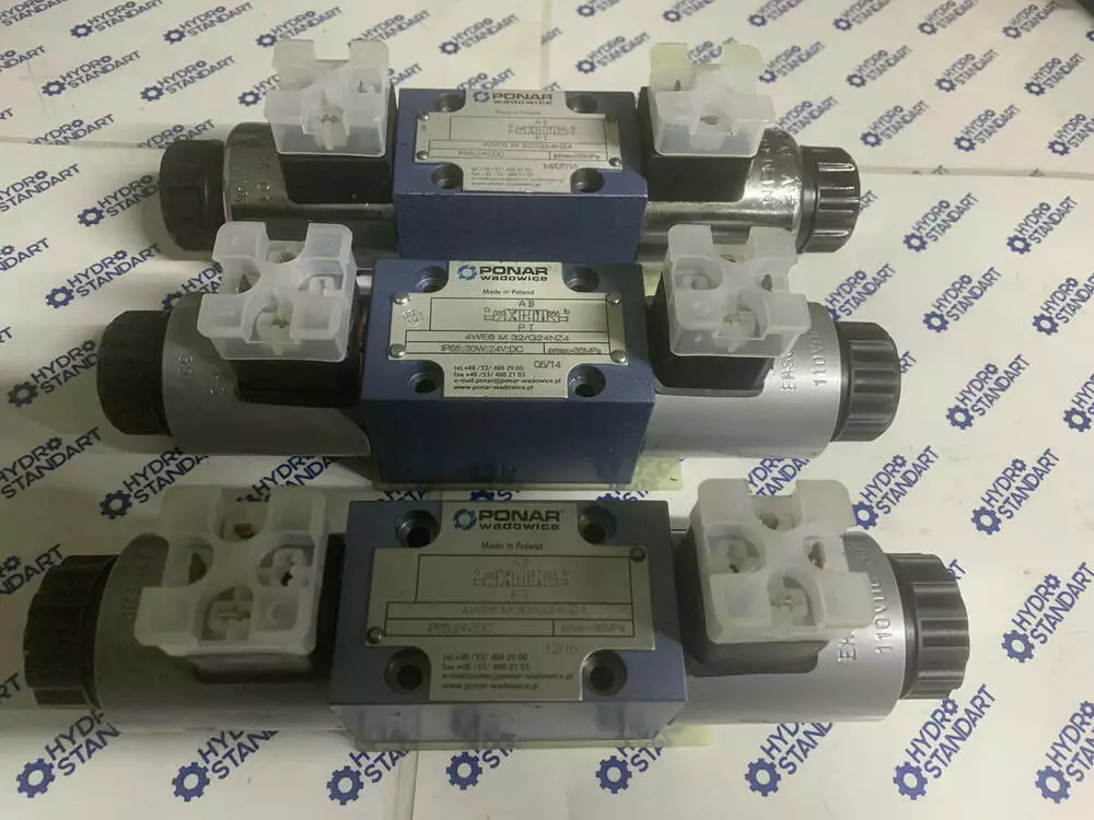 Гідравлічні розподілники Ponar Wadowice 4WE6 призначені для керування й зміни напрямку або пуску та зупинки потоками робочих рідин у гідравлічних системах. Перемикання положення золотника відбувається за допомогою керівного елемента — електромагнітного (привода електромагнітного).