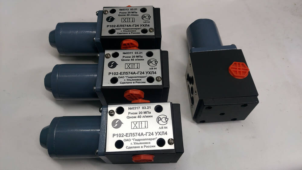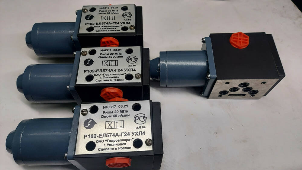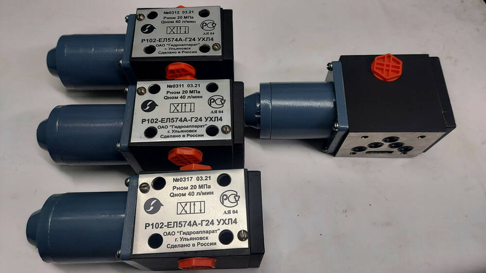 Золотникові гідророзподільники Р102ЕЛ574А призначені для керування (зміни напрямку або пуску й зупинки потоками робочих рідин у гідравлічних системах. Перемикання положення золотника відбувається за допомогою керівного елемента — електромагнітного (привода електромагнітного).