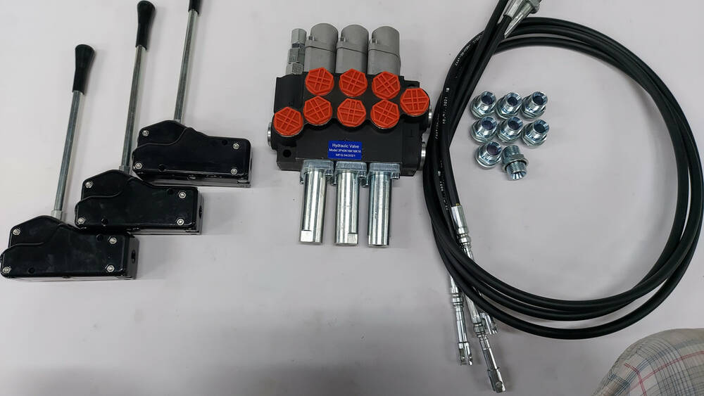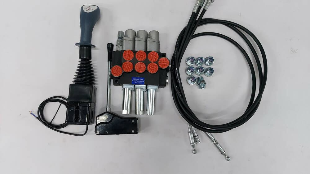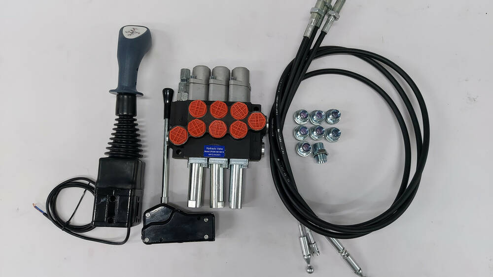 Гідророзподільник Р40 Корейського виробництва на 3 секції з 3 плавальними золотниками ( максимальна комплектація) (підіймання й опускання без фіксації, фіксація тільки в режимі плавального — К16) на тросах 1,5 м (на вибір ходові розміри: 1 м або 2 м, під замовлення можна замовити й іншу довжину троса) з джойстиком 4-коордиатним із кнопкою ( вважаємо джойстик із кнопкою за ціною без кнопки) і тросовим важелем (можна зробити на 3 тросових важелі).