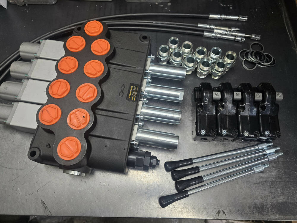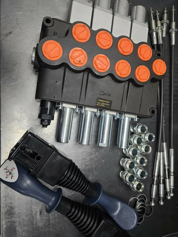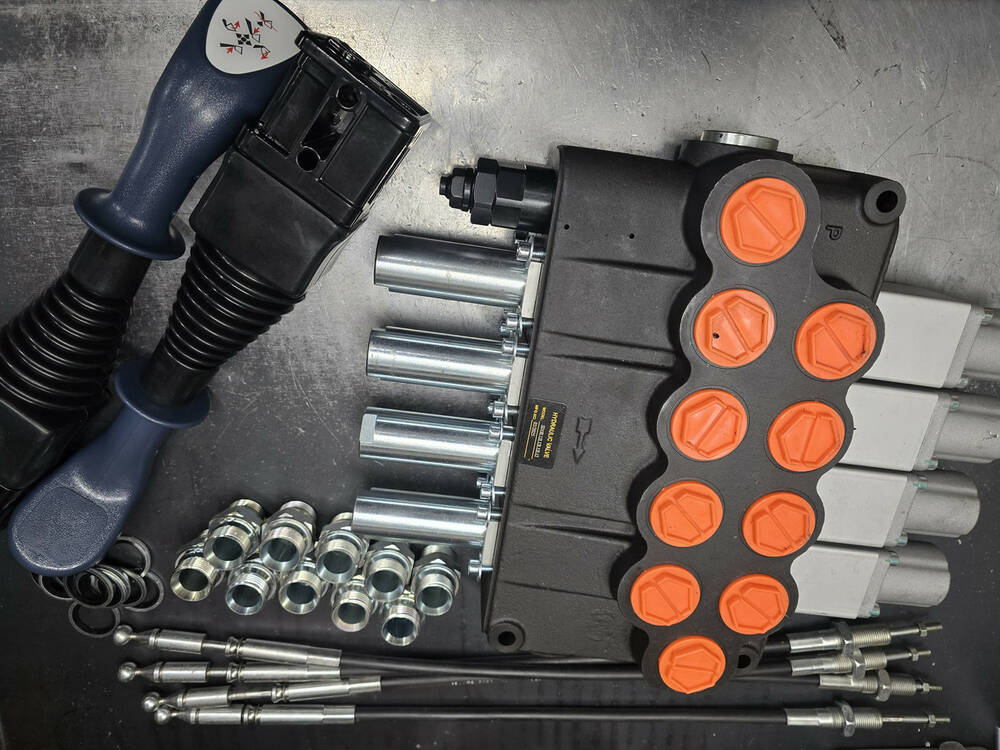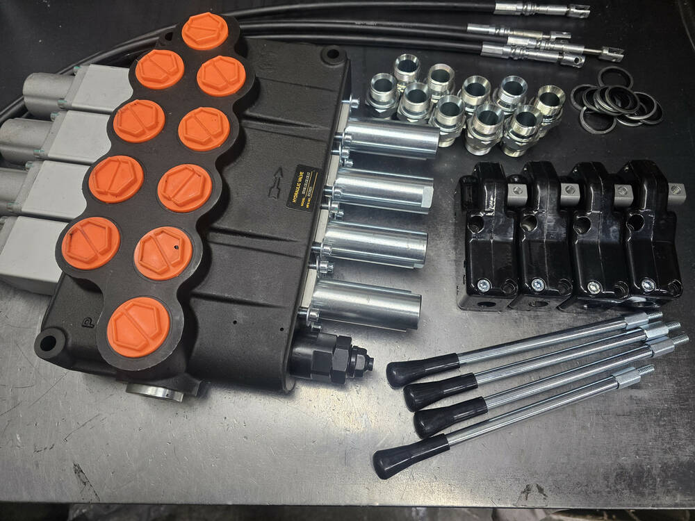 Комплект складається з гідророзподільника 4SD18 L12L12L12 (4 секції 160 л/хв на 4 плавальні золотники), 4 троси будь-якої довжини (від 0.6 м, 0.8 м, 1 м, 1.2 м, 1.5 м, 2.0 м, 2.5 м, 3 м) і 4 ручки тросових типів 3047, а також комплектів із набору штуцерів (адаптер прямий (штуцер-внутрішня різьба) AGR(1"-1"-11 BSP)(в порт)---IR(1/2"-14 BSP) - 8 штук, щоб перейти з внутрішньої різі 1" на 1/2" мамку та далі в неї 8 штуцерів перейти з 1/2" під РВД на ключ 41 або 32 за Вашим бажанням