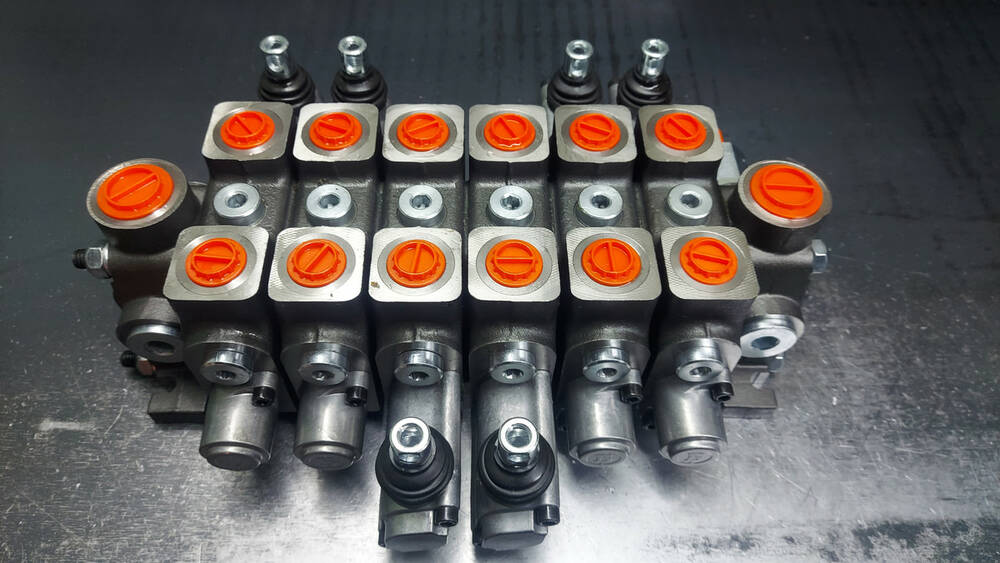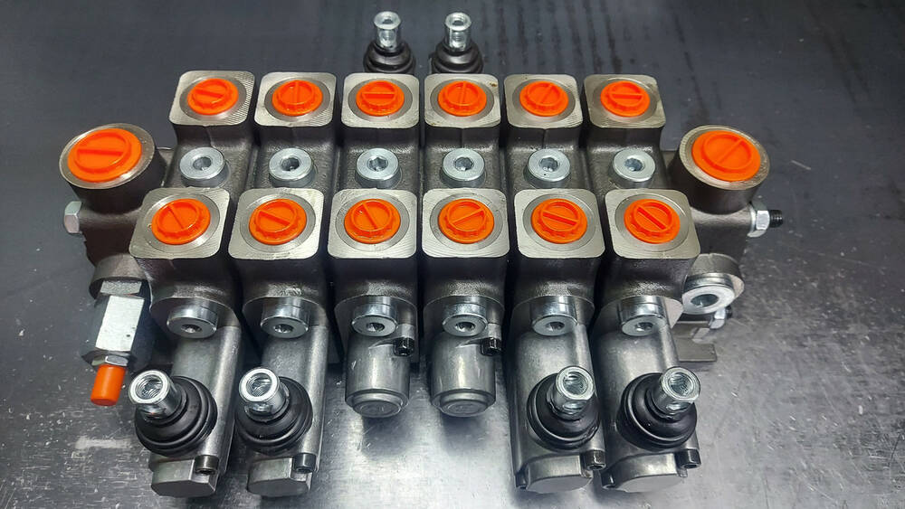 Пропорційний 6-секційний гідророзподільник із номінальною подаванням оливи 100 л/хв ( 120 л/хв максимальна пропускна здатність), виробництва Badestnost, Болгарія, оригінал! Ця модифікація зібрана в такий спосіб, що 2 центральні секції розгорнуті в протилежний бік, для встановлення педалей на них надалі. Цей гідророзподільник має ручне керування, можливо встановити линове керування або керування за допомогою джойстиків, встановлених безпосередньо на гідророзподільнику, а також електричних секцій 12/24 В.