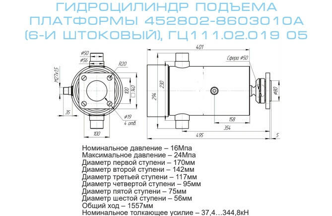 Гідроциліндр КамАЗ 452802-8603010 — це потужний 6-штоковий телескопічний гідроциліндр моделі ГЦ 111.02.019-05, призначений для підіймання кузова великовантажних самоскидів серії КамАЗ. Завдяки послідовному висуненню шести штоків досягається значна висота підйому за збереження компактної довжини в складеному стані. Використовується на кузовах із високою вантажомісткістю.