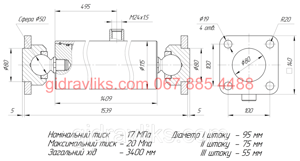 Гідроциліндр 55111-8603010 — це телескопічний 3-штоковий гідроциліндр, призначений для підйому кузова типу “совок” на самоскидах КамАЗ 55111. Модель забезпечує велику висоту підйому завдяки загальному ходу 3440 мм, при збереженні компактної конструкції в складеному стані. Гідроциліндр виготовлений із міцної сталі, має гільзу Ø100×115 мм, посилені хромовані штоки 95, 75 і 55 мм, та типове кріплення цапфа-платформа.