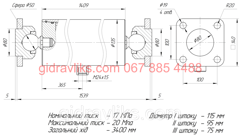 Діаметри штоків: 115 / 95 / 75 мм