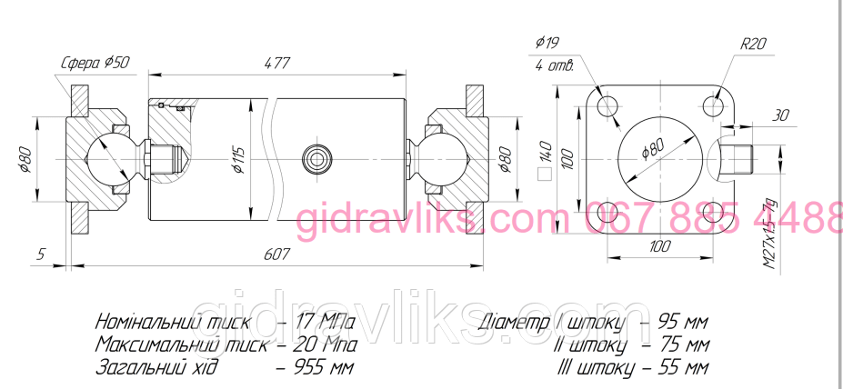 Хід кожного штока ≈ 955 мм / 3 ≈ 318 мм