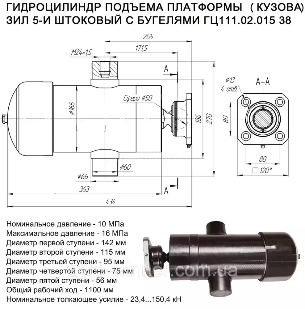 Гідроциліндр ЗІЛ з бугелями встановлюють в гойдалку, яка кріпиться до основної платформи вантажного самоскида ЗІЛ. Приєднання РВТ здійснюється в бугелі, більш точна інформація за розмірами і приєднання - дивіться на креслення на 2 фото.