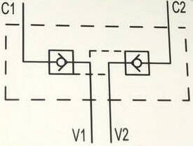 3) Два керовані зворотні клапани (двохклапанний гідрозамок) для замикання гідроциліндру (на прикладі гідроциліндру з рівними робочими майданчиками)