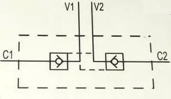 3) Два керовані зворотні клапани (двохклапанний гідрозамок) для замикання гідроциліндру (на прикладі гідроциліндру з рівними робочими майданчиками)