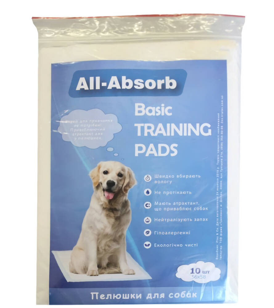 Гігієнічні пелюшки All Absorb Basic для собак з атрактантом (приваблює собаку в туалет), базовий рівень поглинання. Пелюшки підходять для маленьких собак, що не виходять на вулицю, для літніх собак, для цуценят, а також для пологів та використання у ветеринарній медицині.