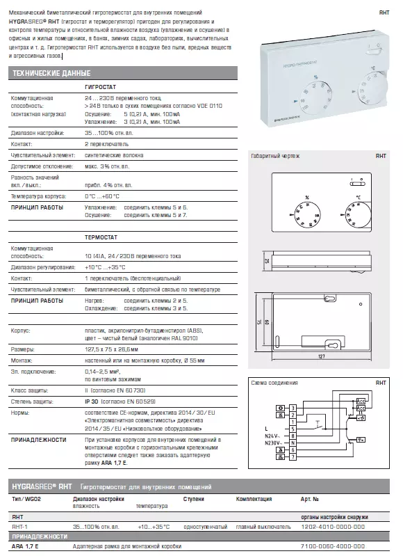 Механічний гігротермостат для приміщень HYGRASREG® RHT (гігростат для приміщень і терморегулятор, біметалевий) придатний для регулювання й контролю відносної вологості (зволоження й осушення) і температури в офісних і житлових приміщеннях, лазнях, зимових садах, лабораторіях, обчислювальних центрах тощо. Гігротермостат RHT використовується в повітрі без пилу, шкідливих речовин і агресивних газів.