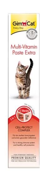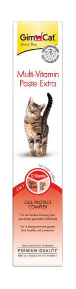 Паста GimCat Multi-Vitamin Extra для доповнення щоденного раціону і підтримки загального стану здоров'я котів. Паста з унікальною формулою клітинного захисту містить комплекс з 12 життєво важливих вітамінів, повноцінний риб'ячий жир і таурин, дріжджову культуру (містить 1% бета-глюкану), які надають комплексний зміцнювальний вплив на імунну систему. В риб'ячому жирі є ПНЖК Омега-3 і Омега-6 кислоти, вони надзвичайно важливі для відновлення клітинних мембран, а також для поліпшення роботи головного мозку і зорової функції. Без ГМО.