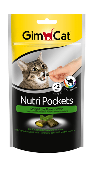 GimCat Nutri Pockets — хрусткі подушечки зі смачною начинкою. Подушечки з котячою м'ятою і пастою «Мультивітамін» містить 12 життєво важливих вітамінів, які служать для зміцнення природних захисних сил організму.