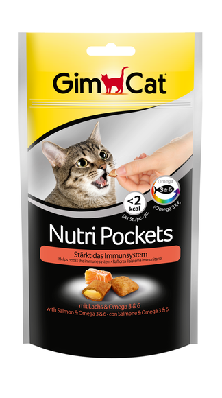 GimCat Nutri Pockets — хрусткі подушечки зі смачною начинкою. Подушечки з лососем і пастою «Мультивітамін Екстра» відрізняються природним вмістом омега-3 і омега-6 жирних кислот для хорошого самопочуття і зміцнення імунної системи.