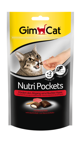 GimCat Nutri Pockets — хрусткі подушечки зі смачною начинкою. Подушечки з яловичиною і солодової пастою містять натуральний ароматний солод і вівсяні волокна. Солод сприяє просуванню їжі, а також природному виведенню поглиненої вовни і неперевариваемых компонентів.