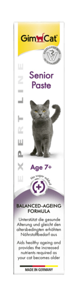 GimCat Senior Paste вітамінна паста для літніх кішок старше 7 років. Позитивно впливає на загальне самопочуття вихованця, покращує обмін речовин кішки, а також зміцнює її кісткову та нервову системи. Паста без консервантів, штучних барвників, підсилювачів смаку, лактози (зі зниженим вмістом лактози), цукру.