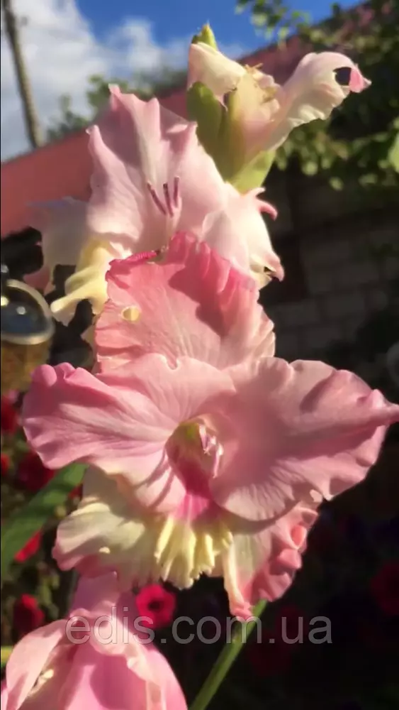 Гладіолус Аланна - сучасний великоквітковий зрізочний сорт. Квіти рожеві з контрастним жовтим язичком, великі, гофровані, щільно розташовані на стеблі.
