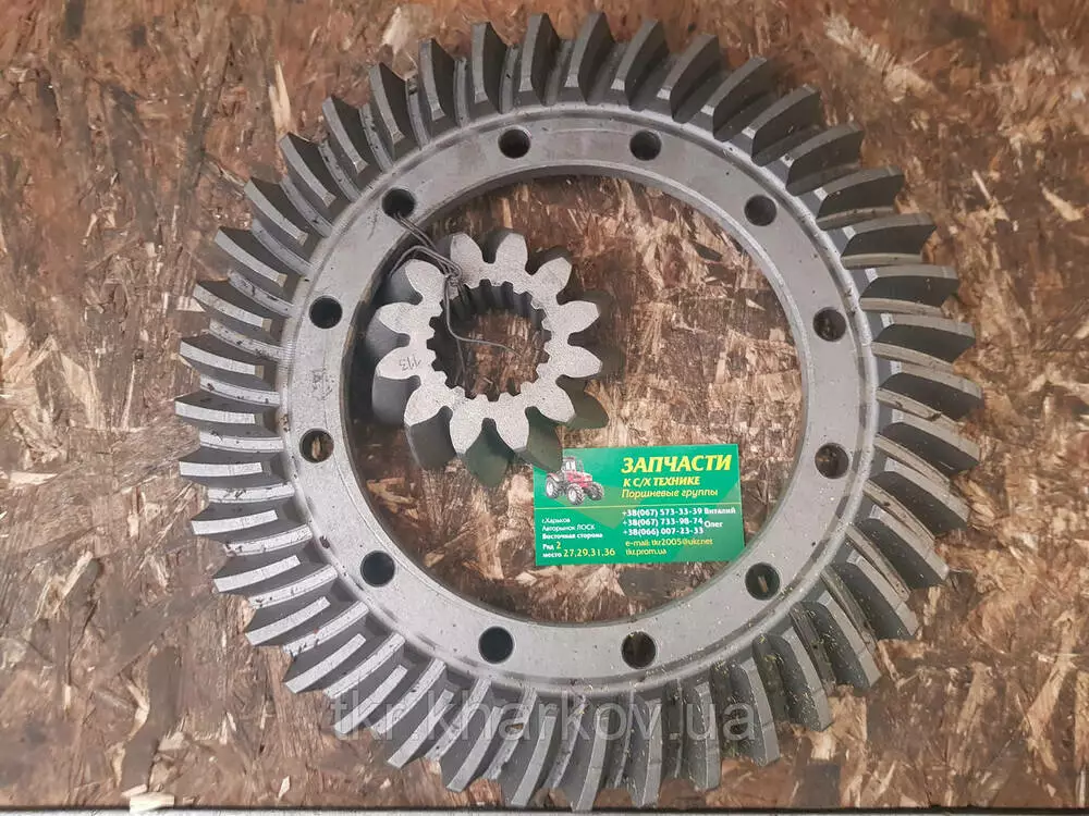 Пропонуємо придбати комплект шестерень — пара конічний заднього моста трактора МТЗ. Номер за каталогом 50-2403014А. Складається з двох шестерень великий — z=41, і маленької z = 12. Застосовується в головному передаванні трактора МТЗ. Використовуються для перетворення обертового моменту та числа обертів вала на вході та виході.