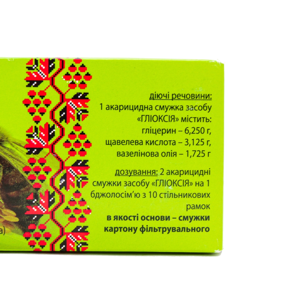 Склад: 1 акарацидна смужка містить: гліцерин - 6,250 г; щавлева кислота - 3,125 г; вазелінове масло - 1,725 г. в якості основи - картон.