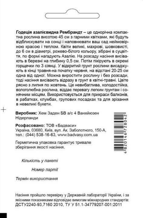 Годеція азалієвидна Рембрандт – це однорічна компактна рослина висотою 45 см з гарними квітками, які будуть відблискувати на сонці і наповнювати ваш сад неймовірною красою і теплом. Квіти великі, махрові, шовковисті, до 6 см в діаметрі, рожево-білого кольору, зібрані в суцвіття, по формі нагадують Азалію. На розсаду насіння висівають в березні на глибину 0,5 см. Потім пікірують в окремі горщечки по 3 сіянці. У відкритий грунт рослини висаджують в кінці травня-на початку червня, на відстані 20-25 см одна від одної. Можна виростити рослину і без розсади, тоді насіння висівають відразу в грунт в квітні-травні. Цвіте рясно з липня по жовтень. Це невибаглива, холодостійка, вологолюбна рослина, віддає перевагу легким грунтам і сонячним місцям. Використовується для прикраси балконів, в рабатках, клумбах, групових посадках та для зрізання в невеликі букети.