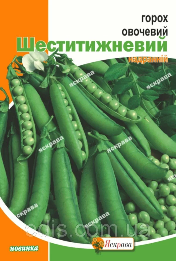 Горох овочевий Шеститижневий 30 г Ранньостиглий лущильний сорт. Вегетаційний період від сходів до технічної стиглості 60-70 діб. Стебло завдовжки 80-100 див. Боби середньовыгнутые, з тупою верхівкою, довжиною 8-9 см, 9-семянные, в технічній стиглості світло-зелені. Смакові якості свіжого горошку відмінні. Сорт відрізняється тривалим періодом збору бобів. Рекомендується для використання в свіжому вигляді, для заморозки та консервування. Сіяти горох потрібно в кінці квітня, коли в ґрунті ще багато вологи. Висівають насіння на глибину 2-3 см рядками, відстань між якими повинна бути 20-30 см Норма висіву насіння до 100 шт. на один метр (2). Высеяные насіння потрібно добре притиснути до ґрунту, щоб воно щільно прилегло до неї. Після появи сходів догляд полягає в розпушуванні міжрядь, поливі і підгодівлі.