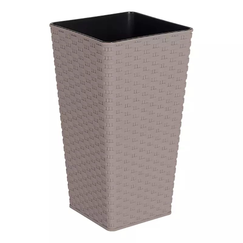 Горщик квадратний Ротанг з поліпропілену оформлений настільки незвичайно, що можуть використовуватися для оформлення як кімнат, так і елементів садової архітектури. Відмінною рисою підлогових горщиків є дизайн, що нагадує плетіння ротанга. Завдяки такому виконанню і стриманому кольору, горщики квадратної форми ідеально впишуться в будь-який інтер'єр. Вазони підійдуть для антуриумов, каланхое, спатифиллума, кімнатних рослин з об'ємною кроною. Для зручності поливу є спеціальна підставка.