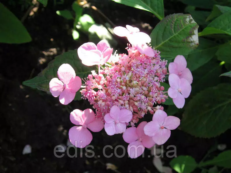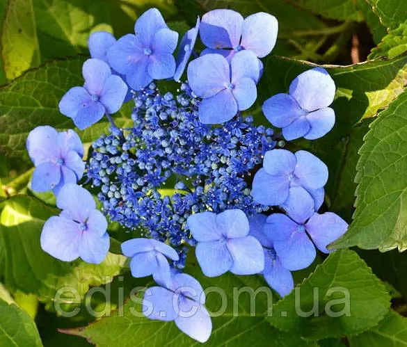 Квітка: Суцвіття дуже красиві, близько 10 см в діаметрі, калиновидные (форми "lace-cap"). Крайові великі квітки 2-3 см в діаметрі, з рівними пелюстками, стерильні (безплідні) небесно-блакитного або фіолетового кольору. Внутрішні дрібні плодоносні (фертильні) квітки лілові з блакитними тичинками. Забарвлення квітки змінюється протягом цвітіння, а також залежить від кислотності ґрунту і змінюється від світло-рожевого до яскраво-синього. Дрібні внутрішні квітки забарвлені більш інтенсивно. Навіть молоді рослини дають велику кількість квіток. При своєчасному видаленні відцвілих суцвіть буде зберігатися великий розмір верхніх квіток.