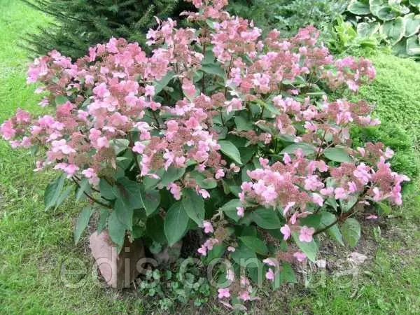 В-третіх – суцвіття у цій гортензії красиве і незвичайне, стерильні і фертильні квітки при відцвітанні мають різне забарвлення. Стерильних (великих) квіток небагато, але вони великі, на початку цвітіння кремові, з часом стають темно-рожевими. Фертильні квітки (дрібні) набувають винно-бордове забарвлення. Це поєднання рожевого і винного виглядає дуже цікаво.