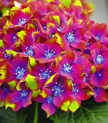 Сама барвиста з усіх гортензій, що розпочинає своє цвітіння із зелених квітів, центр яких починає забарвлюватися в малиновий колір. Червоно - малинові пелюстки доповнені синьо - фіолетовою серединкою і яскраво - синім центром. А до кінця цвітіння на пелюстках з'являються нові відтінки - вони зеленіють і залишають червону облямівку. Чим кисліший грунт, тим більш насичений відтінок квітів. Добре росте на вологих, добре дренованих грунтах. Щоб захистити закладені бруньки від морозу, потрібно гортензію укривати на зиму. Відмінно виглядає у групових посадках як одного сорту, так і у поєднанні з іншими сортами.