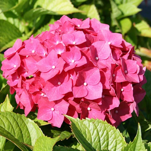 Гортензия крупнолистная Leuchtfeuer (Лойтфоер) -   сорт имеет крупные шапки соцветий , насыщенно-розовые с темно-карминовым оттенком, иногда с зеленовато-кремовым. Привлекают внимание садоводов своей необычной яркой палитрой.