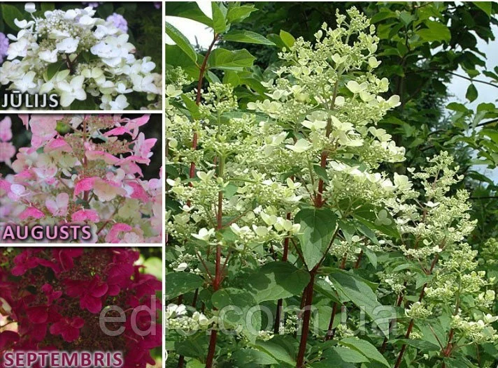 Гортензія Wim's Red Гортензия метельчатая Wim's Red.Новинка.Куст прямостоячий, высотой и диаметром 150-200 см, хорошо разветвлённый, побеги сильные.Выведена селекционером Wim Rutten и сразу же стала мировой сенсацией, т.к этот сорт трижды меняет окрас соцветия - от белого в июле через розовый в августе в темно красный с сентября. Гортензия метельчатая Wim's Red имеет очень крупное соцветие - до 30 - 35 см в длину с чарующим ароматом меда. Но это еще не все его достоинства. Этот сорт так же имеет очень длинный период цветения - со средины июня по октябрь. Сорт устойчивый к болезням. Зона морозостійкості: 5 (-29 / -23 °C). На зиму потребує легкого укриття. Місце для гортензії краще вибрати притінене. Гортензії люблять пухкий, вологий, кислий грунт.