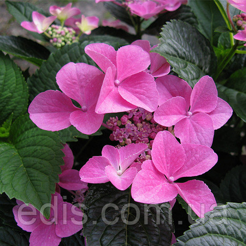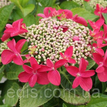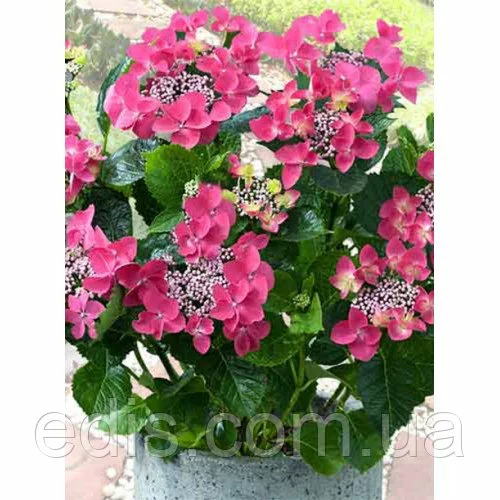 Гортензія крупнолистная Rotkehlchen ( Роткечен ) Висота до 1,25 м, при вирощуванні в контейнерах має висоту 0.4-0.6 м. Дуже цікаві вино-червоні (з відтінком синього) квіти плоскої блюдцеобразной форми, які цвітуть у липні-серпні. В центрі суцвіття дрібні квіти (більш світлі і блідо-блакитні в кінці літа), які по кільцю оточені великими стерильними квітами.