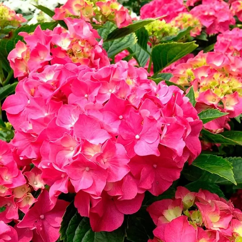 Гортензія Rosita (Hydrangea macrophylla 'Rosita'). Новинка! Прекрасний сорт великолистної гортензії з квітками яскравого кольору. Красива рослина та досить компактна. «Розита» — ефектний листяний чагарник із зубчастим зеленим листям яйцеподібної форми. листя з виразними жилками. Суцвіття великі, кулясті, складаються з численних квіток насичено-рожевого забарвлення. Кущ густий, округлий, з міцними пагонами. Суцвіти кулясті, асиметричної форми, розміром 12-20 см у діаметрі. Вони складаються з маленьких квіток зеленого кольору, які оточені чашками яскравого кольору. Втеча — обдеревне одноріччя. Цвітіння рясне та тривале (до двох місяців).