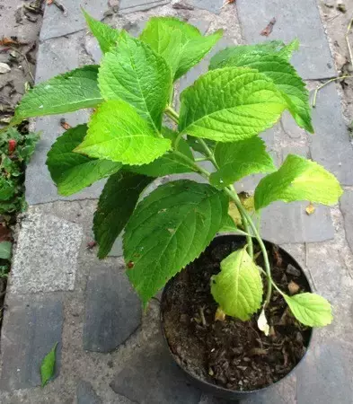 Забарвлення квіток змінюється залежно від індексу кислотності ґрунту. Квітки темно-рожеві, якщо рослина росте в лужному ґрунті або від лілового кольору до фіолетового кольору — у кислому ґрунті. Але вирішальним чинником в забарвленні квіток є сульфат алюмінію. Ви можете самі фарбувати гортензію в потрібний синій колір квітки. Для цього треба поливати рослини розчином квасців кожні 7-10 днів або насипати квацці у формі порошку на землю навколо куща. Дуже цікаво спостерігати той факт, коли квітки на одному кущі різного забарвлення. Одночасно вони й рожеві, і сині, і фіолетові, що має досить цікавий вигляд. Листя цієї гортензії великі, яйцеподібне, товсте, з насічкою. Головною особливістю великолистної гортензії є термін цвітіння всередині літа. (С)