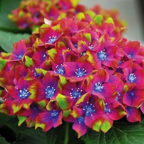 Гортензия крупнолистная Saxon Schloss Wackerbarth – самая красочная гортензия, которая постоянно меняет окраску.Соцветия округлые, плотные.Цветки многочисленные, красно-малиновые с синим центром. На кончике каждого лепестка лаймовый оттенок. Оттенки зависят от кислотности почвы. Чем более кислая почва, тем ярче синий цвет. К концу цветения лепестки зеленеют.