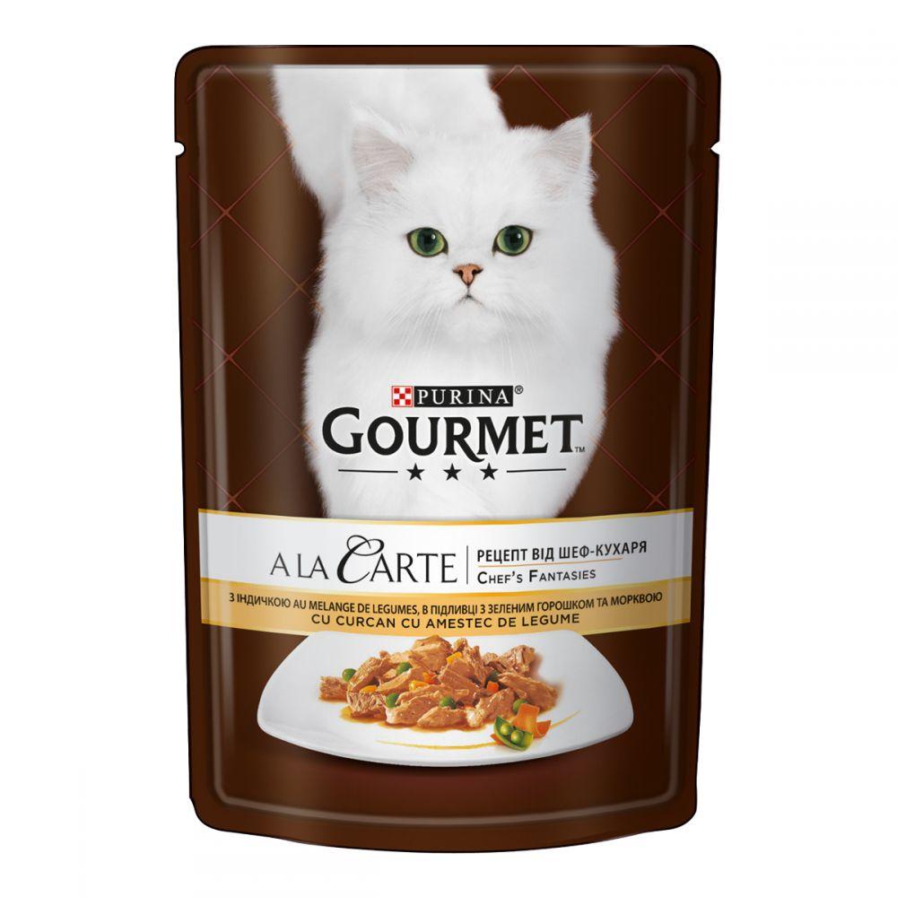 Gourmet A La Carte Шматочки з індичкою, зеленим горошком і морквою в підливі Повноцінний консервований корм для кішок - шматочки з індичкою, зеленим горошком і морквою в підливі. Корм не містить вуглеводів, має в складі необхідну кількість тваринного білка - незамінного джерела енергії, а також вологи, яка підтримає водний баланс Склад: