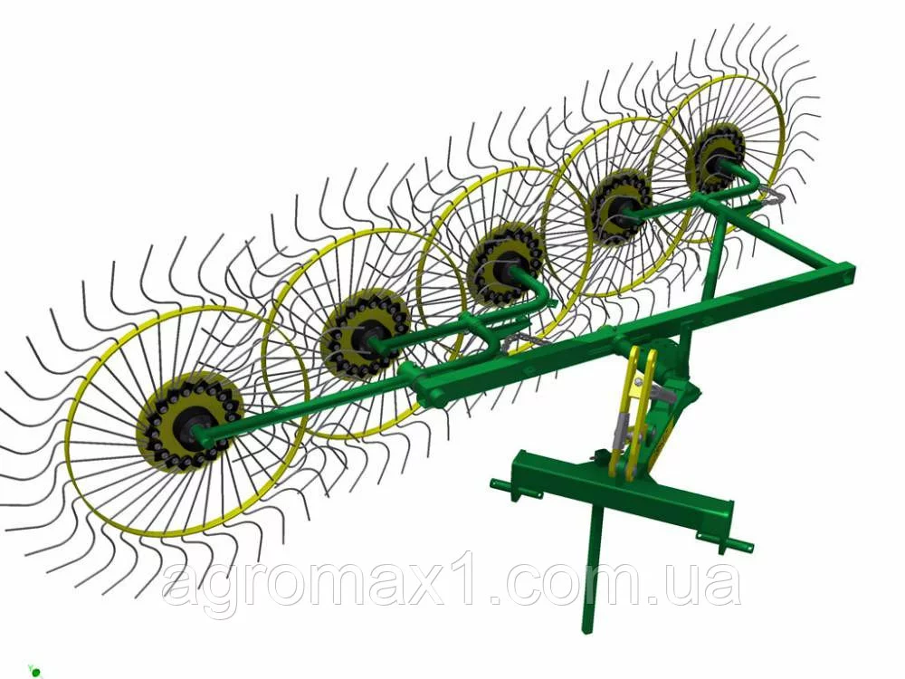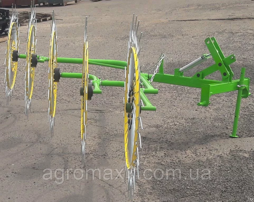 Конструкция, состоящая из пяти расположенных друг за другом колесно-пальцевых механизмов для захвата соломы, позволяет приподнимать траву для улучшения и ускорения просушки. За счет наклоняемой рейки-опоры, на которой закреплены колеса, грабли-ворошилки подходят для эффективного применения на неровной местности. Данные конструкционные особенности делают это оборудование весьма продуктивным и в процессе сгребания сена. Захват высушенной травы происходит одновременно всеми колесами, что позволяет собрать максимальное количество сена и сделать более ровные гряды. Грабли-ворошилки 5-ти колесные позволят выполнить работы по просушке и уборке сена с максимальной производительностью за короткий срок, учитывая особенности рельефа.
