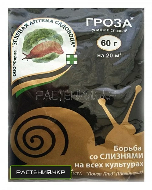 Гранули препарату Гроза мають блакитний колір, до складу яких входить активна речовина (метальдегід) проти слимаків, а також речовини добавки, що залучають шкідників і відлякують птахів. Слимаки та равлики охоче йдуть на гранули Грози, а не на рослини і після контакту з препаратом втрачають слиз і гинуть. Гинуть тільки слимаки та равлики, на комах, ссавців, птахів та дощових черв'яків препарат не діє.