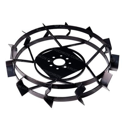 Обод колеса изготовлен из стальной полосы шириной 30 мм и толщиной 4 мм. Диаметр колеса по зацепам 600 мм, по ободу 520 мм. Шип грунтозацепа имеет высоту 40 мм. Ширина колеса 110 мм.