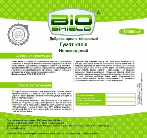 Гумат Калію - органо-мінеральне добриво на основі екологічно-чистого низинного торфу. Сприяє мобілізації захисних властивостей рослин. Застосування даного добрива дозволяє гарантовано отримати урожай, навіть при екстремальних кліматичних умовах, наприклад, при заморозках або під час посухи. 0.4-0.5 л/Га
