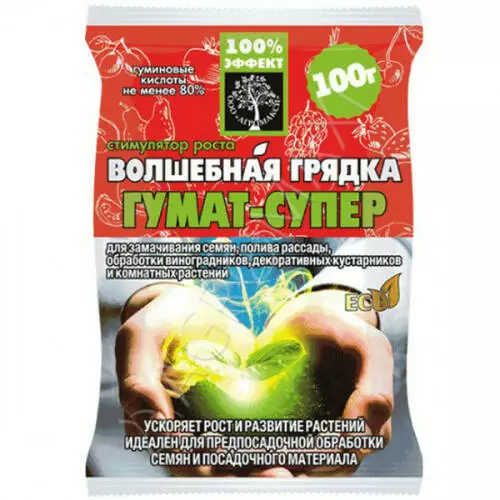 Гумат супер 100 г - стимулятор росту, для замочування насіння, поливу розсади, обробки виноградників, декоративних чагарників та кімнатних рослин.