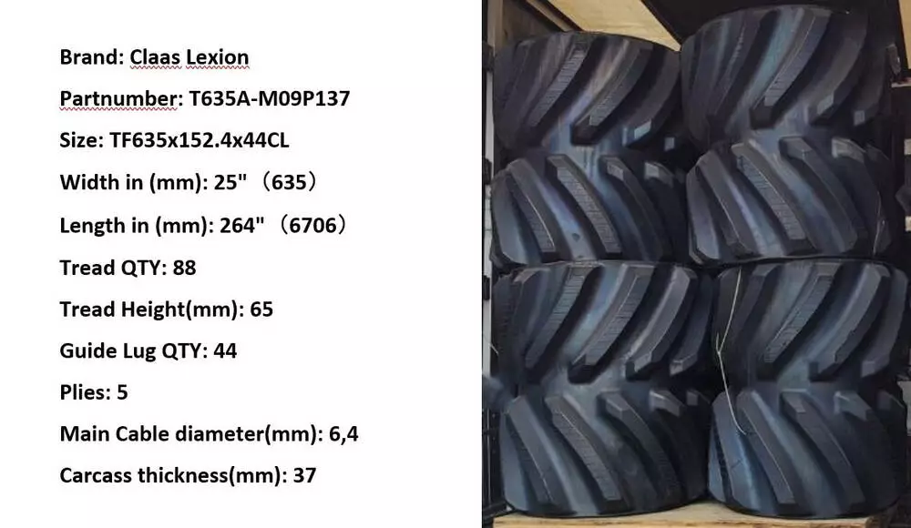 Гумова гусениця CLAAS LEXION Terra Track 25″x6″x44 (635mm) Claas Lexion 450 tt 460 tt 470 tt 480 tt 490 tt 560 tt 570 tt 580 tt 585 tt 590 tt 595 tt 600 tt 660 tt 670 tt 680 tt 690 tt 750tt 760 tt 770 tt 780 tt 6800 tt 8700 tt 0007503562, 7503562 0007640940 0007649650 0007649640 0017001290