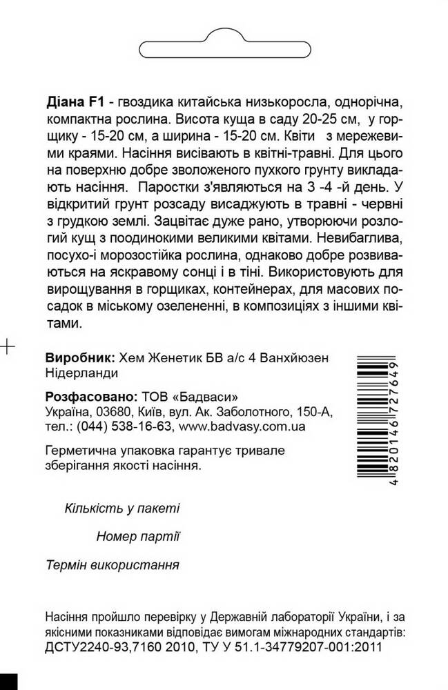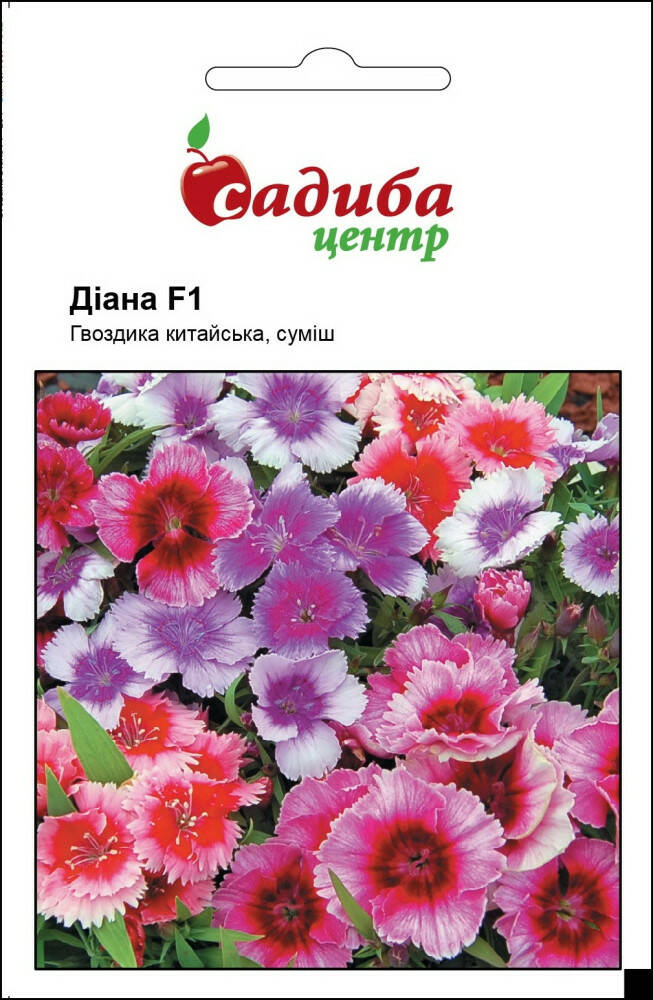 Гвоздика Діана F1 - гвоздика китайська низькоросла, однорічна. Це компактна, скоростигла рослина. Висота куща в саду 20-25 см, у горщику - 15-20 см, а ширина - 15-20 см. Квіти з мережевими краями. Насіння висівають в квітні-травні. Для цього на поверхню добре зволоженого пухкого грунту викладають насіння. Паростки з'являються на 3 -4 -й день. У відкритий грунт розсаду висаджують в травні - червні з грудкою землі. Зацвітає дуже рано, утворюючи розлогий кущ з поодинокими великими квітами. Невибаглива, посухо-і морозостійка рослина, однаково добре розвиваються на яскравому сонці і в тіні. Використовують для вирощування в горщиках, контейнерах, для масових посадок в міському озелененні, в композиціях з іншими квітами.