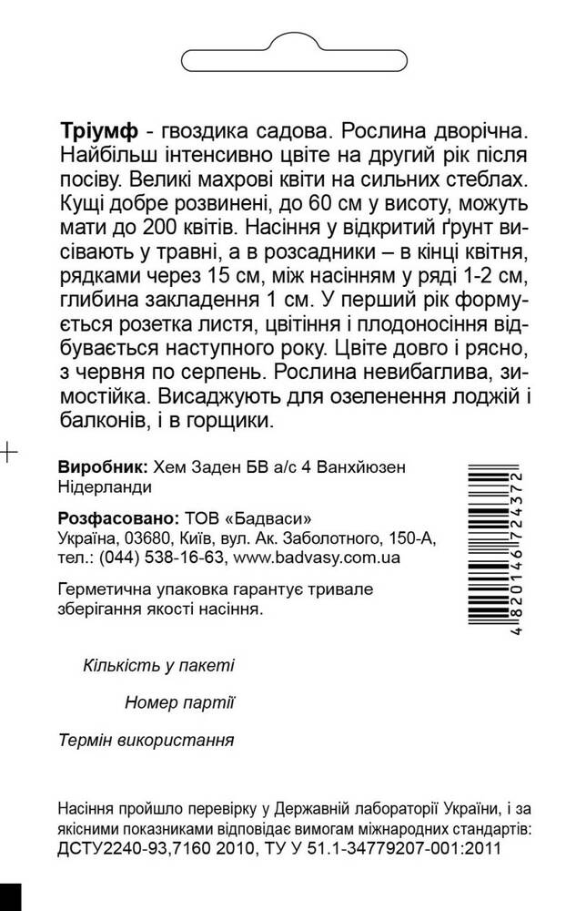 Гвоздика Тріумф - гвоздика садова. Рослина дворічна. Найбільш інтенсивно цвіте на другий рік після посіву. Великі махрові квіти на сильних стеблах. Кущі добре розвинені, до 60 см у висоту, можуть мати до 200 квітів. Насіння у відкритий ґрунт висівають у травні, рядками через 15 см, між насінням у ряді 1-2 см, глибина закладення 1 см, а в розсадники – в кінці квітня. У перший рік формується розетка листя, цвітіння і плодоносіння відбувається наступного року. Цвіте довго і рясно, з червня по серпень. Рослина невибаглива, зимостійка. Висаджують для озеленення лоджій і балконів, і в горщики.