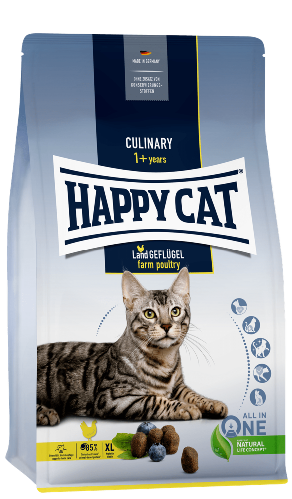 Смачний рецепт Happy Cat Culinary Adult Large з ніжною домашньою птицею вільного вигулу, соковитою чорниці і ароматною кульбабою забезпечує кішок великих порід всім необхідним для здорового і щасливого життя.