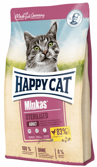 Minkas Sterilised - це повноцінний базовий корм з невеликою кількістю жирів і спеціально підібраним рівнем баластних речовин для дорослих стерилізованих кішок.