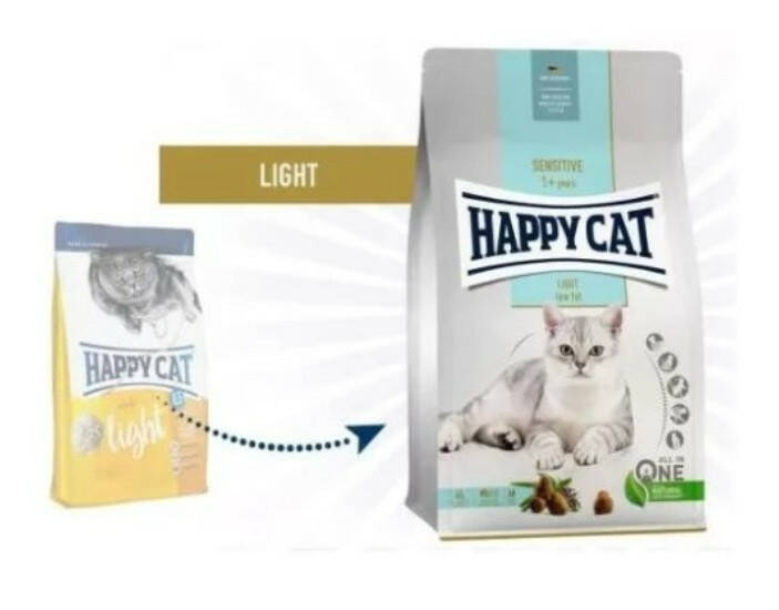 Багато домашніх кішок ведуть малорухливий спосіб життя, що призводить до набору зайвої ваги. Крім того, стерилізовані тварини внаслідок гормональних порушень також легко набирають вагу. Корм Хеппі Кет Адалт Лайт містить мінімальну кількість жирів (8,5%) і достатню кількість білків – близько 35%, джерелом яких служать лосось, птах і кролик. Корм швидко насичує кішку, при цьому не перевантажує травну систему. Всі його компоненти легко перетравлюються і засвоюються. Унікальна технологія виробництва корму LifePlus Concept максимально зберігає цінні поживні речовини, повністю забезпечуючи кішку. Вітаміни і мікроелементи, які містяться в кормі Happy Cat, підтримують захисні системи організму, забезпечують прекрасний вигляд, активність і довге життя улюбленця.